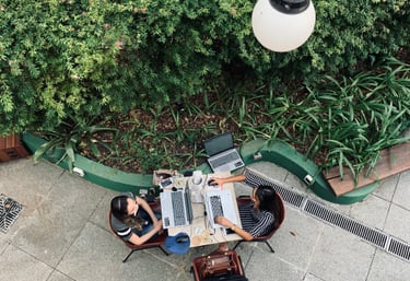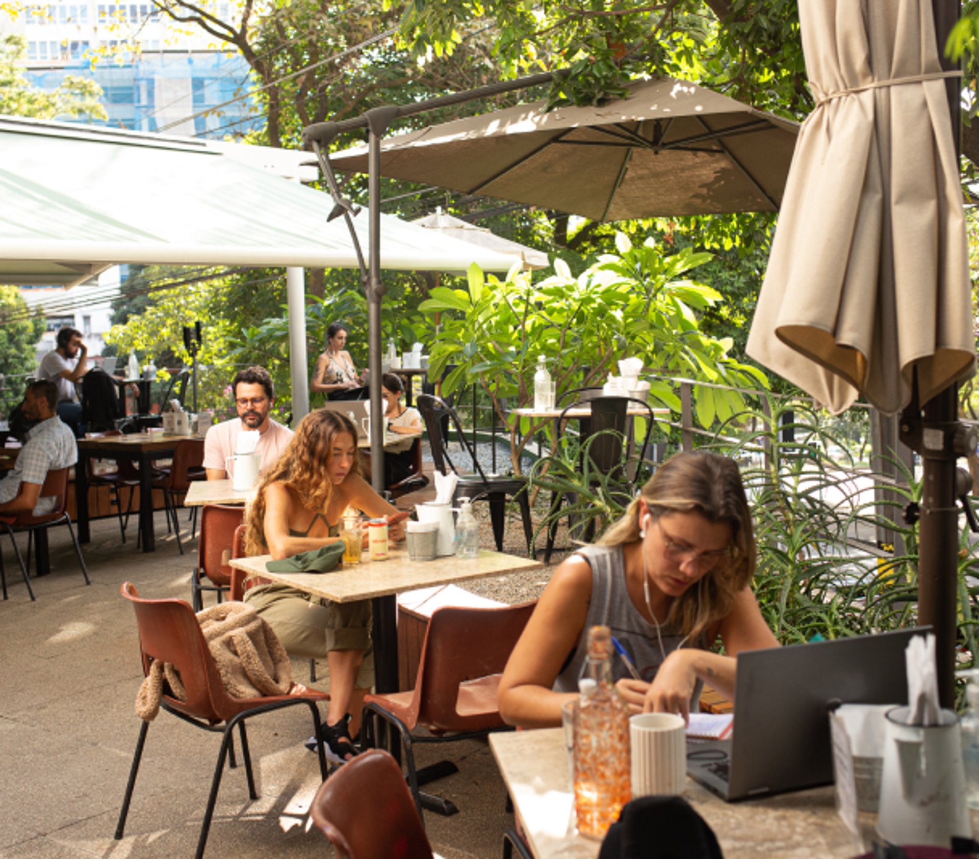 ideal para quem gosta de trabalhar ao ar livre em um ambiente de café e coworking.